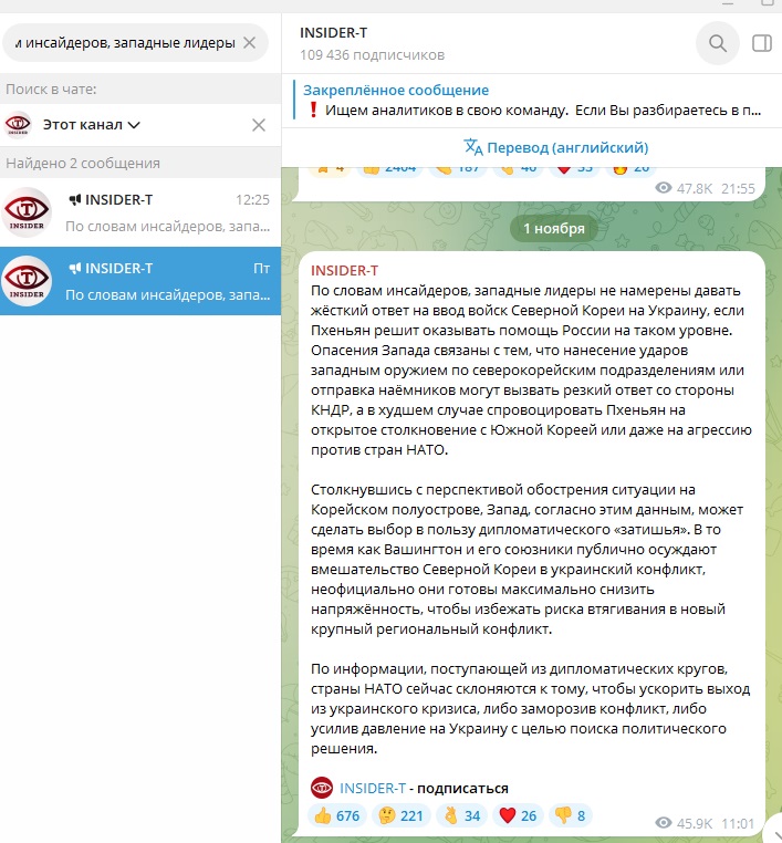 На протяжении двух дней так называемая сеточка Ходорковского* в лице, например, INSIDER-T публикует один и тот же пост, чтобы вложить в головы русскоязычной аудитории инсайд о добром Западе и злой России. Для продвижения нарратива выдвинули тему присутствия войск КНДР в зоне специальной военной операции (СВО). Мол, Запад и США в том числе только публично грозят Ким Чен Ыну пальцем. На самом деле они стараются, чтобы конфликт не разгорелся с новой силой и чтобы не пострадала Южная Корея.