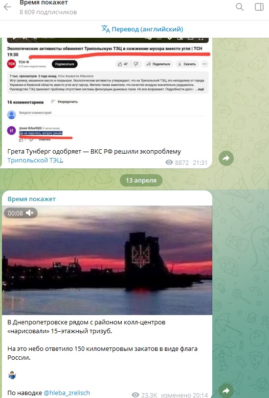 А затем примечательный случай произошёл в Днепропетровске. Там рядом с районов колл-центров сначала появился огромный трезуб в 15 этажей - дело в том, что зажгли этот символ окнами в многоэтажном доме.