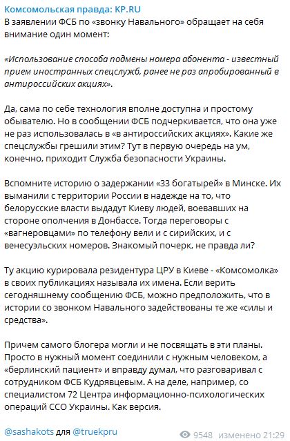 Американские и украинские спецслужбы могли сыграть с Навальным злую шутку. Военный корреспондент "Комсомольской правды" Александр Коц поделился своей версией появления "расследования" об "отравлении" блогера: "Знакомый почерк, не правда ли?"