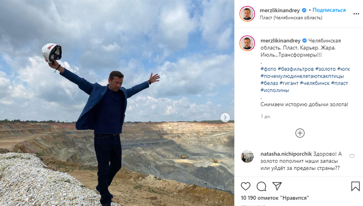 Актер культового "Бумера" и других любимых россиянами фильмов прилетел на Южный Урал. Тут он снимает документальный фильм про историю добычи золота. Своими впечатлениями делится у себя в Instagram и, между прочим, отвечает на все вопросы подписчиков. Вчера Андрей Мерзликин выложил пост о том, как спустился в шахту "Центральная" в Пласте. Он назвал ее "подземным мегаполисом":