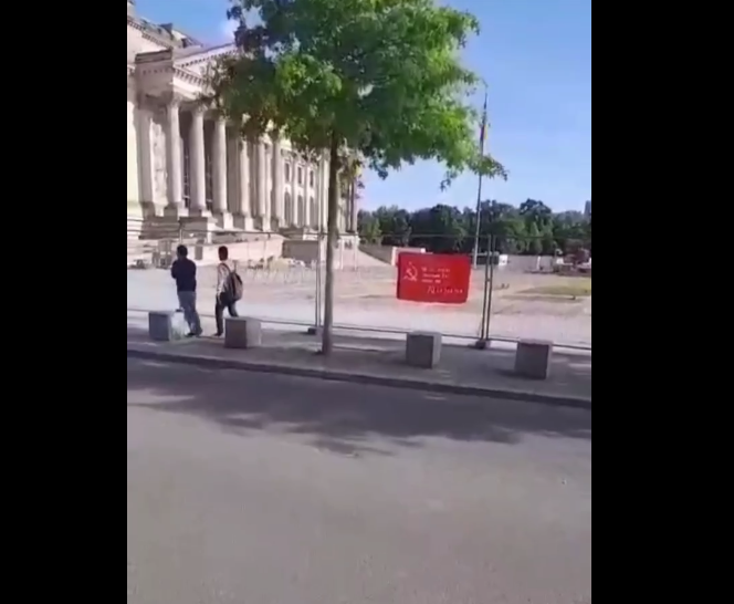 Неизвестные развернули Знамя Победы перед зданием бундестага в Берлине. На ограде возле здания парламента был растянут и закреплён красный стяг, с которым 79 лет назад солдаты Красной Армии зашли в Берлин.