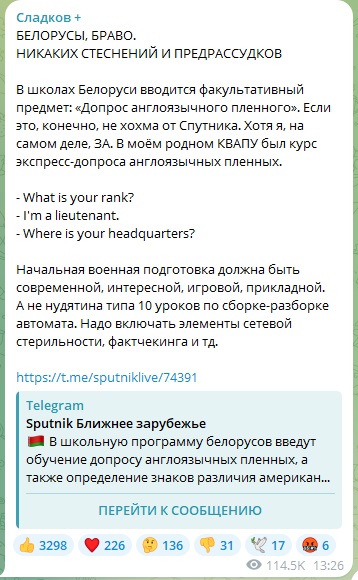 Военкор Александр Сладков оценил белорусскую инициативу положительно. Он заметил: без стеснений и предрассудков наши соседи расставили приоритеты, диктуемые самими нынешними реалиями жизни.