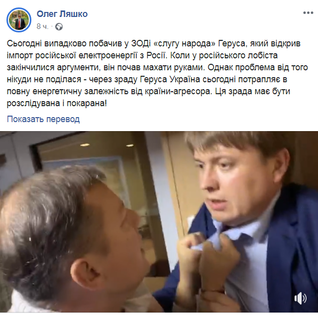 "Когда у российского лоббиста закончились аргументы, он начал махать руками. Однако проблема от этого никуда не делась — из-за измены Геруса Украина попадает в полную энергетическую зависимость от страны-агрессора", - написал Олег Ляшко на своей странице в Facebook, опубликовав видеозапись драки.