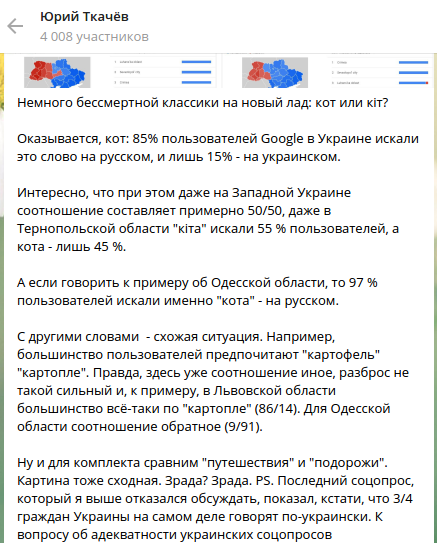 Главный редактор одесского издания "Таймер" Юрий Ткачёв на примере слов "кот" и "картофель" доказал, что украинцы чаще выбирают для поисковиков написание на русском языке, а не на мове. "Зрада? Зрада", - приходит к выводу автор поста.