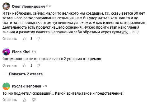 Читатели Царьграда напомнили, что и у нас в России есть свои режиссёры, которые ставят подобные развратные постановки. И не абы где, а в Москве. Критике читатели подвергли супруга Собчак Константина Богомолова: "А что? У нас тоже и Богомолов, и ещё масса такое вытворяют и называется "это" - авторское видение!!", "Богомолов такое же показывает в 2 шагах от Кремля".