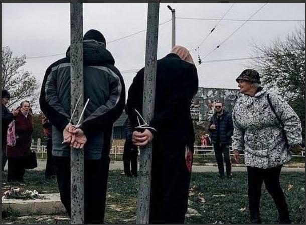 На фото из Херсона запечатлены привязанные к столбам люди, которых приковали укронацисты. Так же поступали фашисты во времена Великой Отечественной войны: привязывали к столбам и истязали.