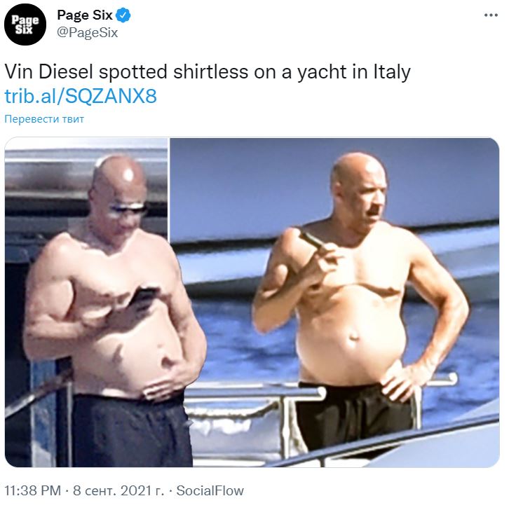 Однако сделанные папарацци фотографии оставили фанатов в недоумении. На снимках Дизель изображён отдыхающим на яхте вместе с друзьями. В глаза сразу бросается огромный "пивной" живот, нависающий над купальными плавками.