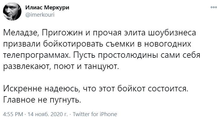 Меладзе, Пригожин и прочая элита шоу-бизнеса призвали бойкотировать съёмки в новогодних телепрограммах. Пусть простолюдины сами себя развлекают, поют и танцуют. Искренне надеюсь, что этот бойкот состоится. Главное не спугнуть, - пишет журналист Илиас Меркури.