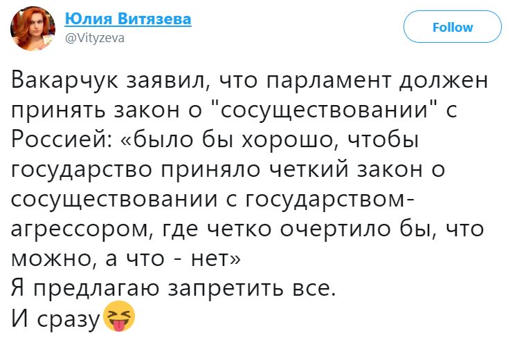 Пользователь Твиттера с ником skyjoker70 интересуется: "Какого рожна Вакарчук будет писать правила? Агрессор устанавливает правила. Он может только под шконку залезть и скулить: я не сдамся без бою". Другие участники обсуждения также сочли более логичным, если такой закон будет подан на рассмотрение Госдумой РФ, а не Верховной радой.