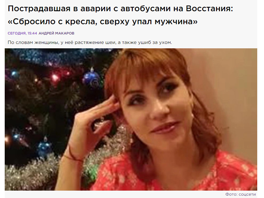 Чувствую себя относительно неважно, только что из больницы приехала - там сказали, что всё в порядке, переломов нет. Я услышала сильный звук, похожий на взрыв, меня сбросило с кресла, сверху упал мужчина. Маршрут № 181, мы поехали с ребёнком погулять в Смольный монастырь. Долго в автобусе закрытом сидели, потом только, когда скорая и спасатели приехали, нас спросили, чего вы сидите, и вывели нас из автобуса. У меня растяжение шеи, ушиб за ухом - видимо, когда мужчина упал,