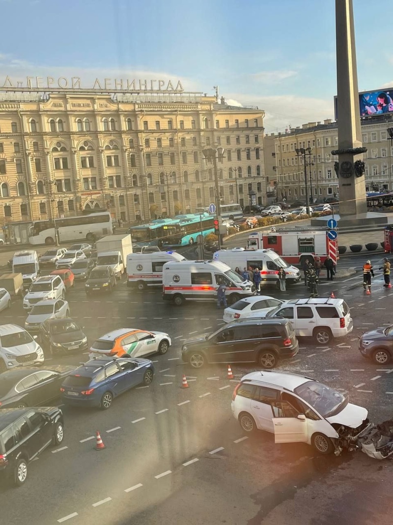 В Петербурге на площади Восстания иностранный водитель за рулём бирюзового автобуса устроил замес с участием другого автобуса и ещё двух легковых машин - пострадали 25 человек,