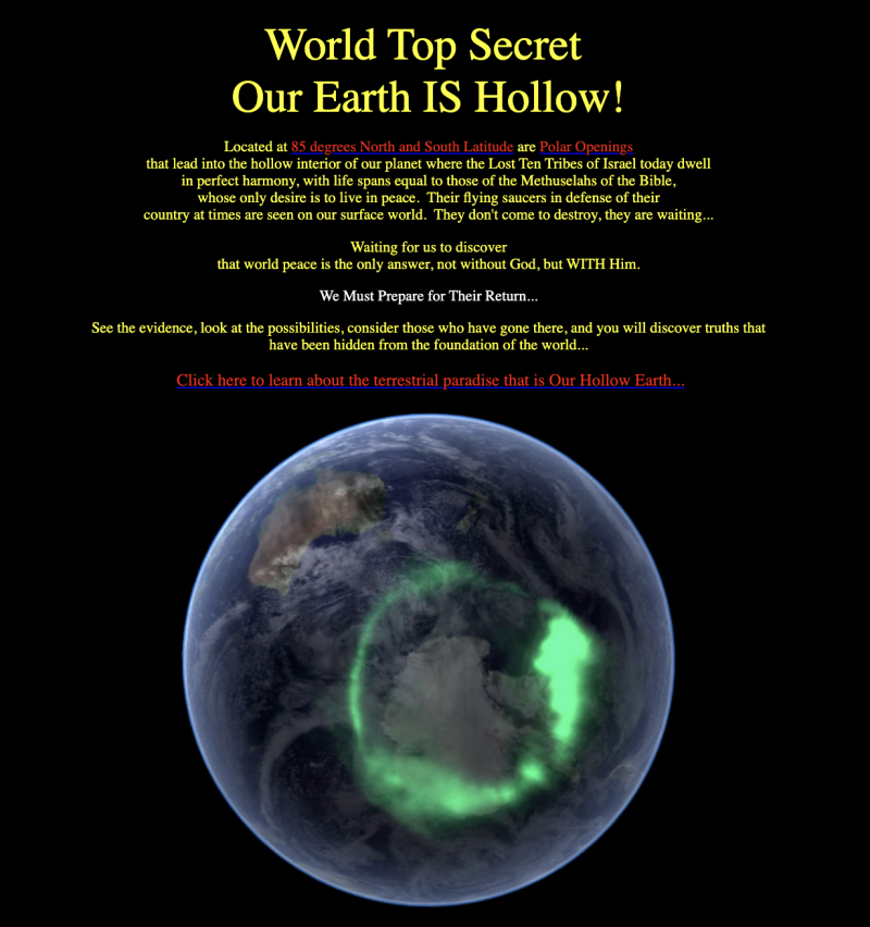 Теория "полой Земли" продолжает существовать, и хотя её сторонники не создают международных обществ, они активно отстаивают свои взгляды и верят в заговор против них. Среди их убеждений такая, что северное сияние вызывается внутренним солнцем, и экзотические теории побега Гитлера в 1945 году внутрь Земли.
