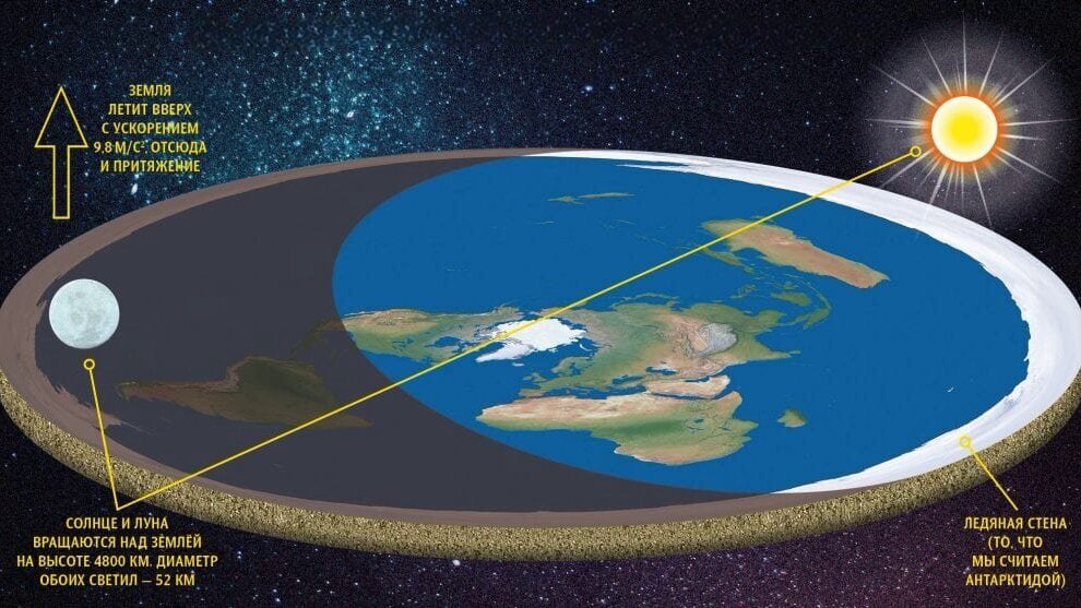 Согласно их представлениям, Солнце и Луна вращаются над поверхностью Земли, а звёзды следуют тому же пути. Гравитации, по их мнению, не существует, а сила тяжести возникает из-за того, что диск движется вверх с ускорением 9,8 м/с². Кроме того, геодезические расчёты не учитывают кривизну Земли, что также служит аргументом в пользу их теории.