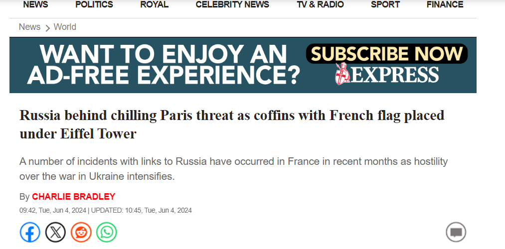 "Россия стоит за пугающей Париж угрозой в виде гробов с французским флагом, установленных под Эйфелевой башней". Скриншот: express.co.uk