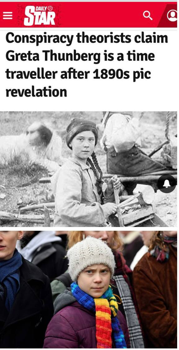 Конспирологи утверждают, что Грета Тунберг – путешественница во времени. Канадская девочка, попавшая в объектив в конце XIX века на руднике во времена Золотой лихорадки, – копия Греты Тунберг, и конспирологи уверены, что она "прилетела из будущего, чтобы остановить глобальное потепление". Фото: скриншот новости The daily