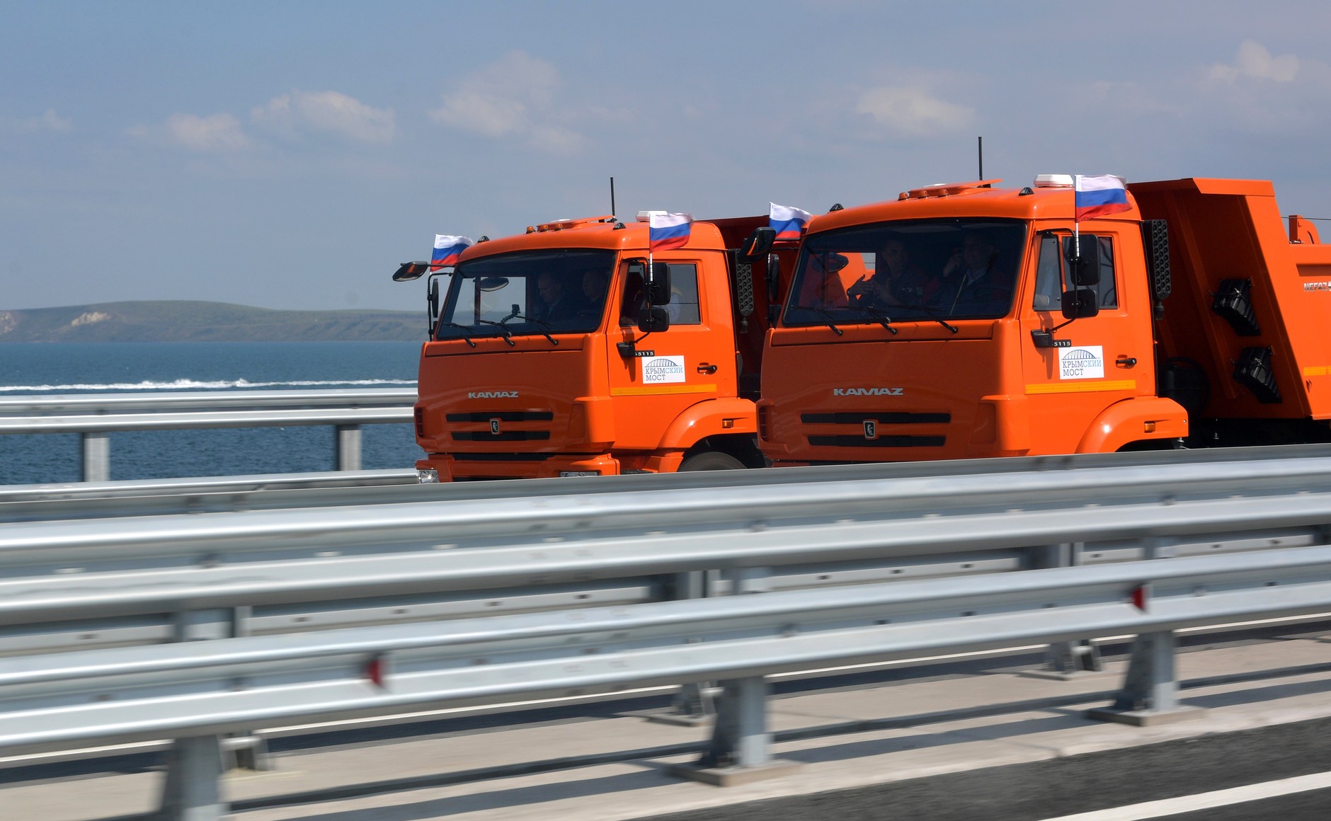 В ходе тестов автомобильной части по Крымскому мосту прогнали колонну грузовиков. За рулем одного из них находился президент России Владимир Путин. Фото: Kremlin Pool/Globallookpress.