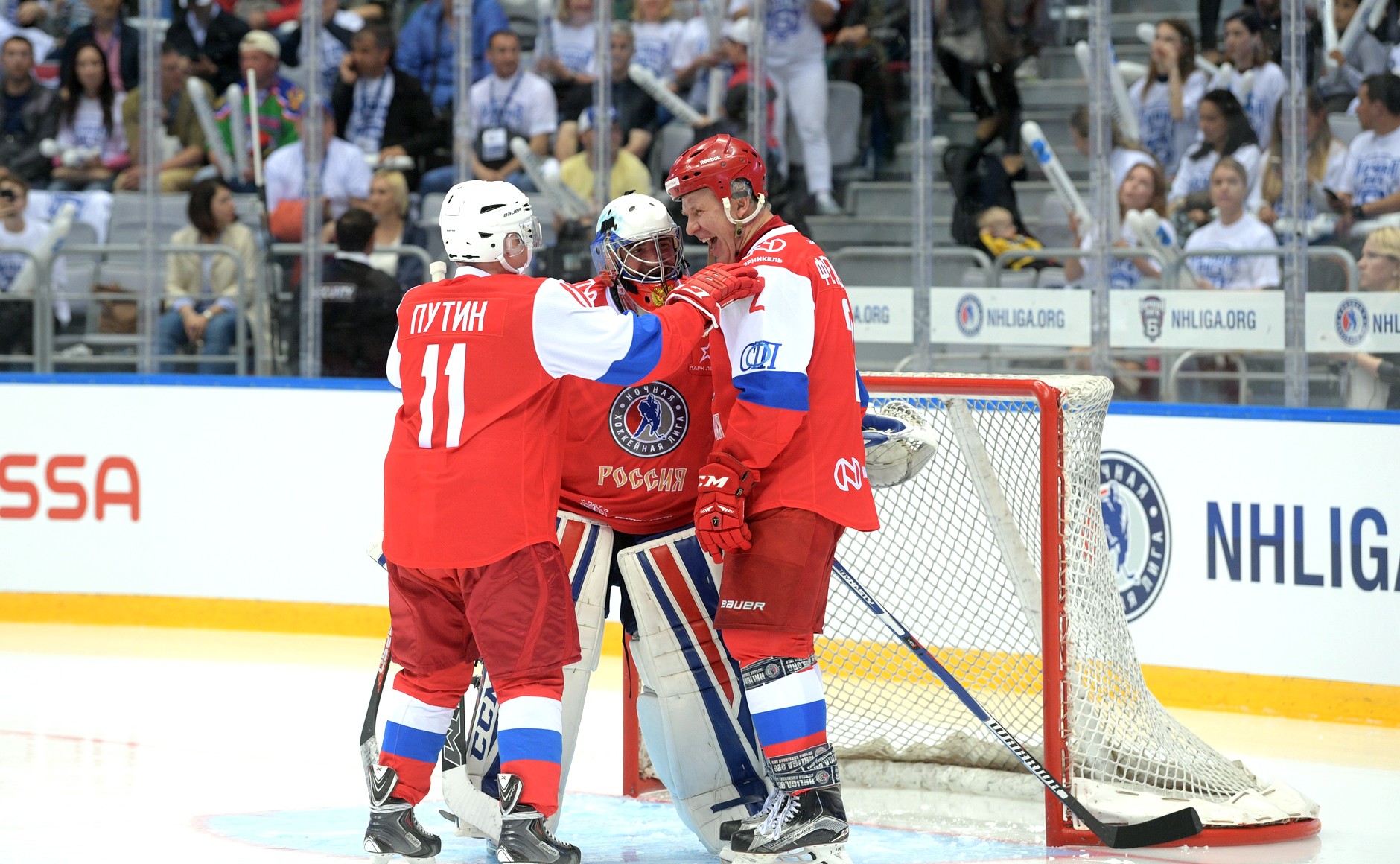 10 мая 2017 г. Президент России Владимир Путин, губернатор Тульской области Алексей Дюмин и первый заместитель председателя комитета Государственной Думы по физической культуре, спорту, туризму и делам молодёжи Вячеслав Фетисов (слева направо) во время гала-матча VI Национального фестиваля Ночной хоккейной лиги на стадионе "Хоккейная лига". Фото: © Kremlin Pool/Globallookpress.
