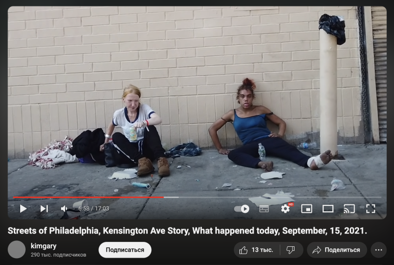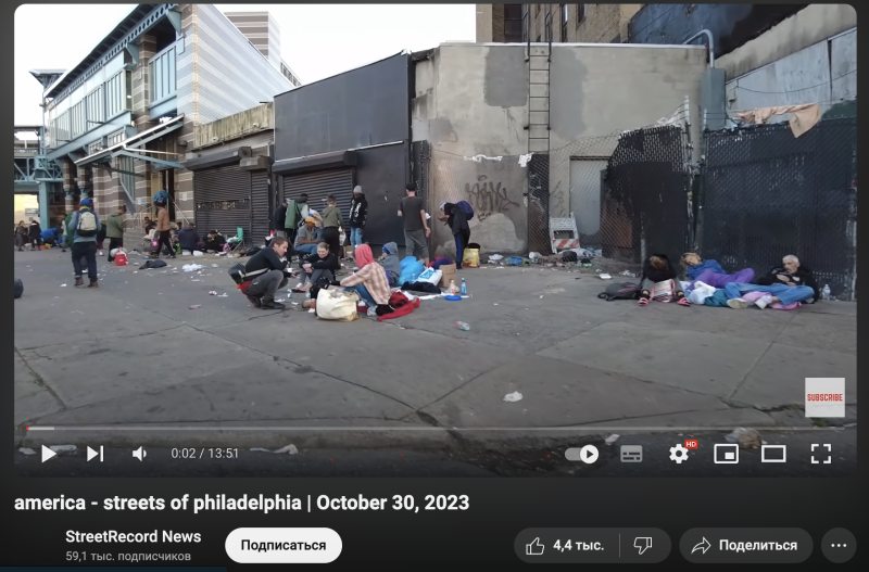 Люди под воздействием наркотиков бредут шатаясь по улицам, лежат без сознания на земле, палатки для бездомных разбиты повсюду, а мусор заставляет вас всё время спотыкаться... Можно подумать, что это картинка из очередного голливудского хоррор-фильма про зомби. Но нет, эта жуткая реальность была запечатлена на видео, снятом на улицах солнечной Филадельфии.