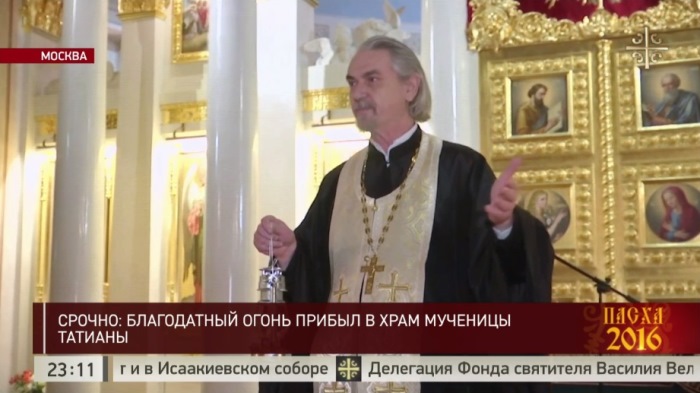 23:13"Фонд Андрея Первозванного привез Благодатный Огонь из Иерусалима, - говорит настоятель храма Мученицы Татианы. - Сейчас мы зажжем свечи. Я отдам этот фонарь, который повезут дальше. А перед крестным ходом мы раздадим Благодатный Огонь для ваших свечек. И на крестном ходу он будет у каждого.