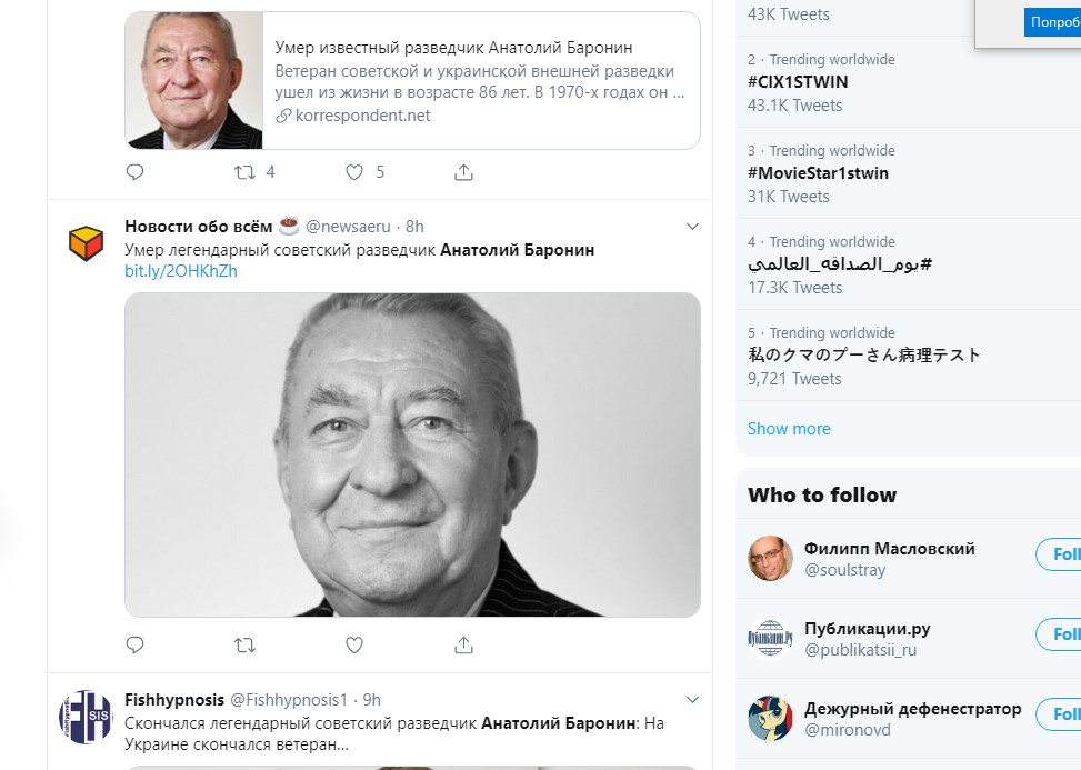 Ветеран советской разведки, полковник в отставке Анатолий Баронин скончался на 87-м году жизни. Легенда и "мастер шпионажа", как писали о нем западные СМИ, в 1970-х годах смог раздобыть информацию о новой в то время болезни - лихорадке Эбола.