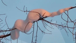 В Балашихе на ветке дерева повис сугроб в форме змеи.